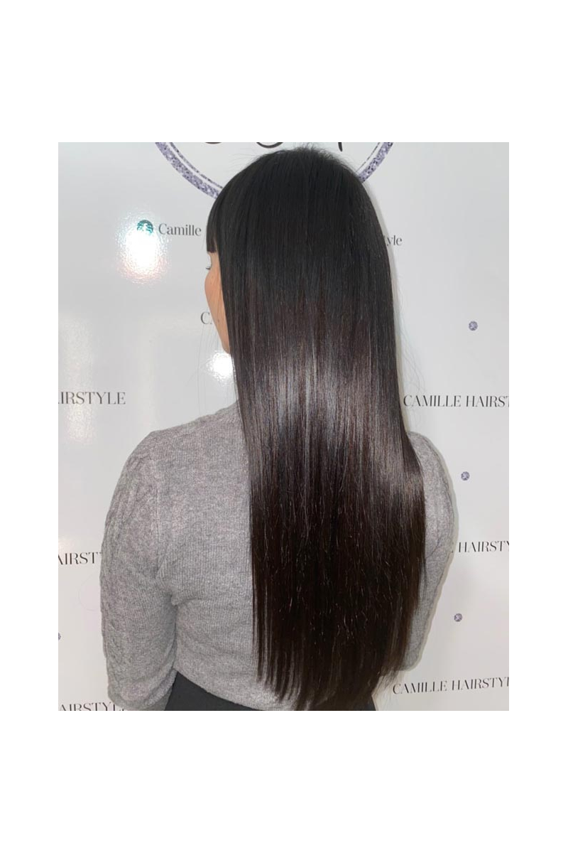 All'estremità di ogni extension a freddo capelli lisci si trovano un cappio e un tubicino di metallo siliconato con punto di fissaggio in cheratina fredda. L'extension si fissa sui capelli senza calore né colle, una pinza per extension sarà sufficiente per fissare correttamente la ciocca. Il cappio e il tubicino sono già presenti su ogni extension e non comportano alcun rischio per i capelli e il cuoio capelluto.